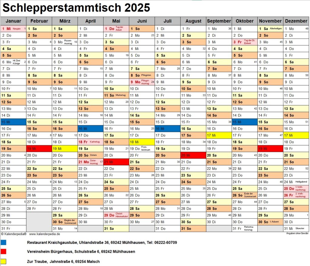 wir treffen uns jeden dritten Mittwoch im Monat zum gemeinsamen Schlepperstammtisch. Den Ort des Treffpunktes entnehmt Ihr bitte auf unserer Webseite unter http://schlepperfreunde-muehlhausen.de/termine/