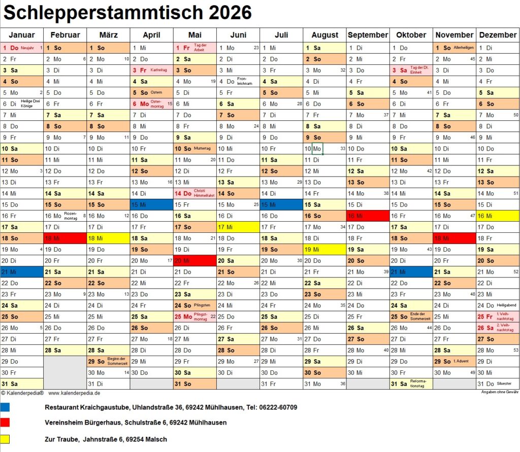wir treffen uns jeden dritten Mittwoch im Monat zum gemeinsamen Schlepperstammtisch. Den Ort des Treffpunktes entnehmt Ihr bitte auf unserer Webseite unter http://schlepperfreunde-muehlhausen.de/termine/